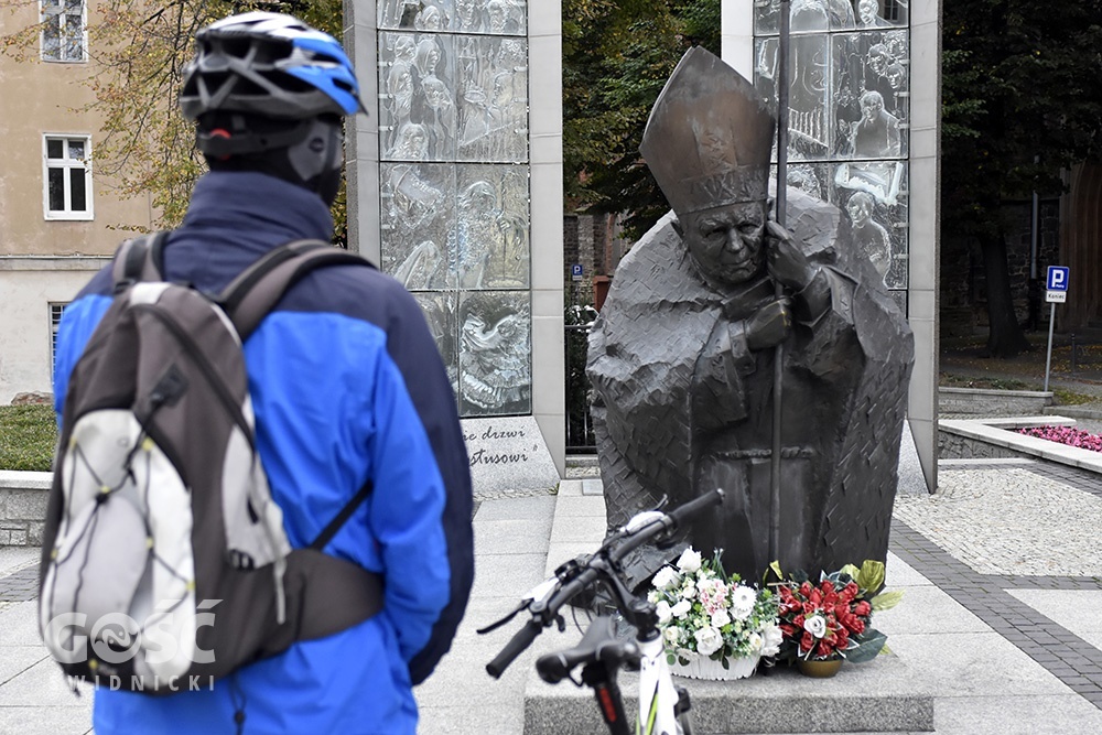 Spod pomnika św. Jana Pawła II w Świdnicy do pomnika Papieża Polaka w Bardzie 10 października ks. Krzysztof Ora pojechał z trzema rowerzystami.